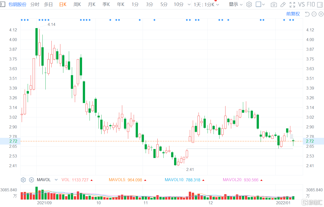 格隆汇1月12日丨包钢股份(600010.SH)跌超5%,报2.71元,成交额放大至30.7亿元,总市值1235亿元。公司2021年净利润24.4亿-36.5亿元,同比增长501.05%-799.11%。据此计算,Q4净利预计亏损1.28亿元-13.38亿元。