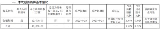 本次质押股份4.2亿股,占其所持公司股份的1.67%,占公司总股本比例的0.92%。质押期限为2022年6月23日至2023年6月23日。