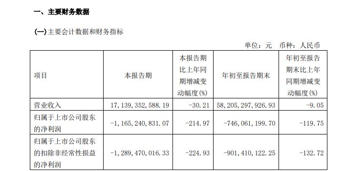 包钢股份27日晚间公告,第三季度营业收入171.39亿元,同比下降30.21%;净亏损11.65亿元,亏损幅度扩大214.97%;前三季度净亏损7.46亿元,上年同期37.78亿元,由盈转亏;基本每股收益-0.0164元。
