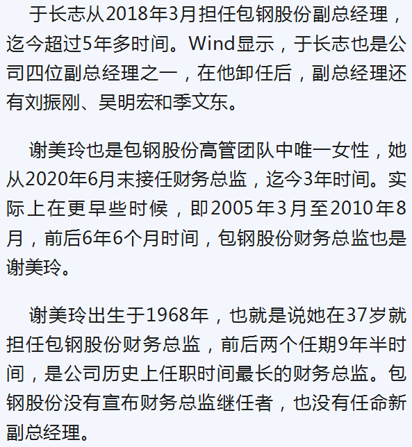 内蒙古包钢钢联股份有限公司(简称“包钢股份”)最新公告称,因工作调整,谢美玲申请辞去财务总监职务,于长志申请辞去副总经理职务,两人将不在公司内担任其他职务。