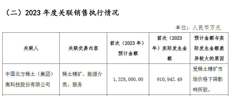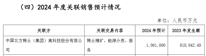 此前,包钢股份发布包钢股份2023年年度股东大会材料,其中提到2024年度关联销售预计情况:预计2024年包钢股份与北方稀土的关联交易额106.1亿元。