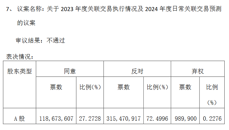 5月13日,包钢股份股东大会召开。在此次会议上,《关于2023年度关联交易执行情况及2024年度日常关联交易预测的议案》被否,反对票3.15亿票,占比72.4996%。