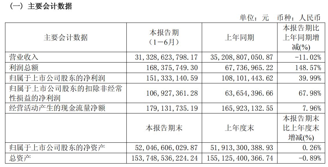 今年上半年,包钢股份实现营收313.29亿元,同比下降11.02%;公司归属于上市公司股东的净利润(以下简称“归母净利润”)1.51亿元,同比增长39.99%;利润总额1.68亿元,同比增长148.57%;经营活动产生的现金流量净额1.79亿元,同比增长7.96%。