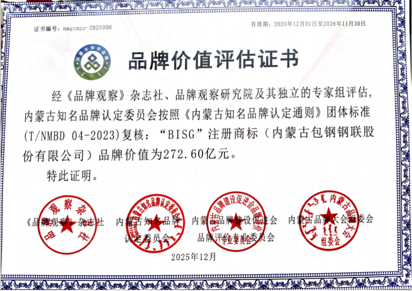近日, 包钢 股份“ 包钢 /BISG”品牌价值再传捷报——经权威评估,2025年度品牌价值达272.6亿元,较上年同比增长11.01亿元,同时 包钢 股份被评为“内蒙古钢铁行业标志性品牌”“内蒙古品牌建设标杆企业”“内蒙古知名(百强)企业”等荣誉称号,实现 包钢 股份品牌建设实力与市场认可度的同步跃升。这一亮眼成绩,既是市场对 包钢 股份“优质精品钢+系列稀土钢”战略的高度认可,更是企业以创新驱动转型、以品质赢得信赖、以责任践行使命的生动写照。