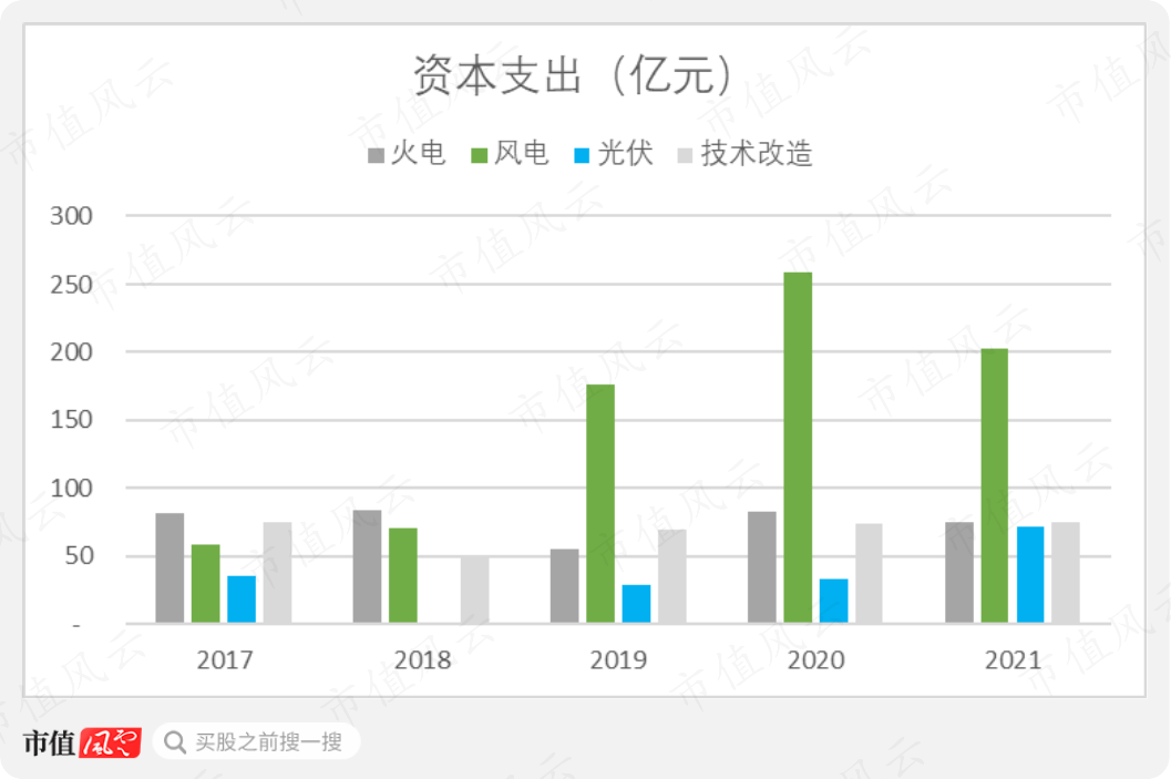 从资本支出的绝对值上来看,公司对风光的投入并不低,而且近三年的投资较之前有较大提升。2017年至2021年间,公司在风电和光伏项目上累计共投入936亿元,占总资本支出的55%。
