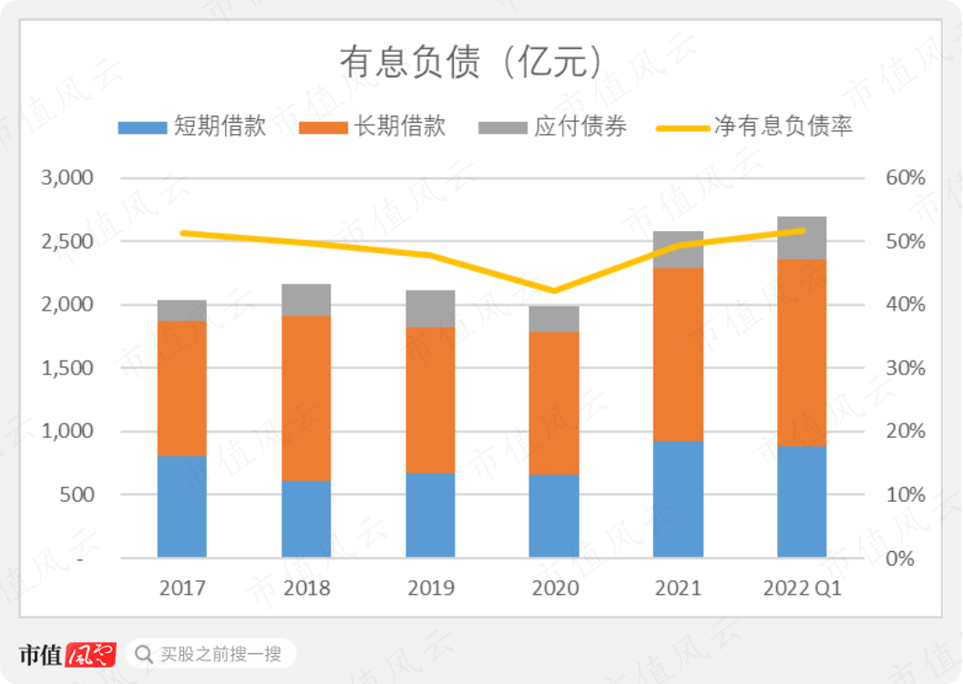 另外,公司拥有大量的长期借款、短期借款和部分应付债券。截止到2022年3月31日,公司的有息负债共计约2700亿元。
