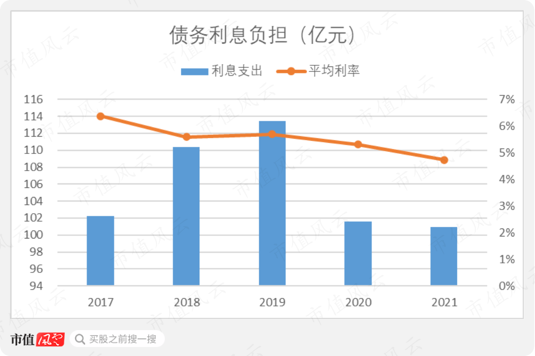 公司债务的平均利率近年来在逐渐下降,对应利息支出自2020年已经有大幅下降。