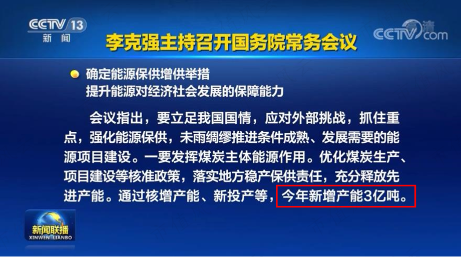 而且在今年4月20日的国务院常务会议宣布今年仍会新增产能3亿吨。在这6亿吨产能投产后,煤炭的供应能力会逐渐加强。