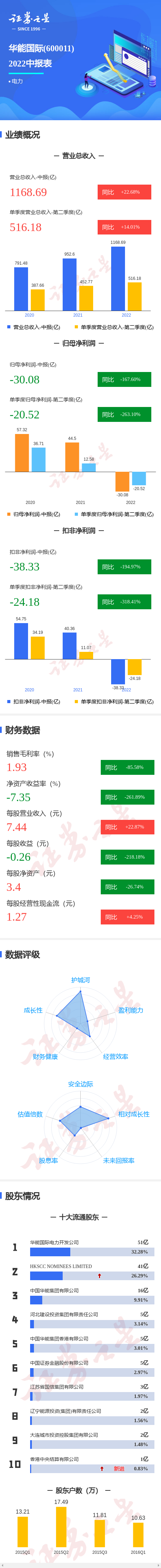 华能国际2022中报显示,公司主营收入1168.69亿元,同比上升22.68%;归母净利润-300868.73万元,同比下降167.6%;扣非净利润-383367.06万元,同比下降194.97%;其中2022年第二季度,公司单季度主营收入516.19亿元,同比上升14.01%;单季度归母净利润-205234.91万元,同比下降263.1%;单季度扣非净利润-241898.9万元,同比下降318.41%;负债率75.06%,投资收益6.71亿元,财务费用48.65亿元,毛利率1.93%。