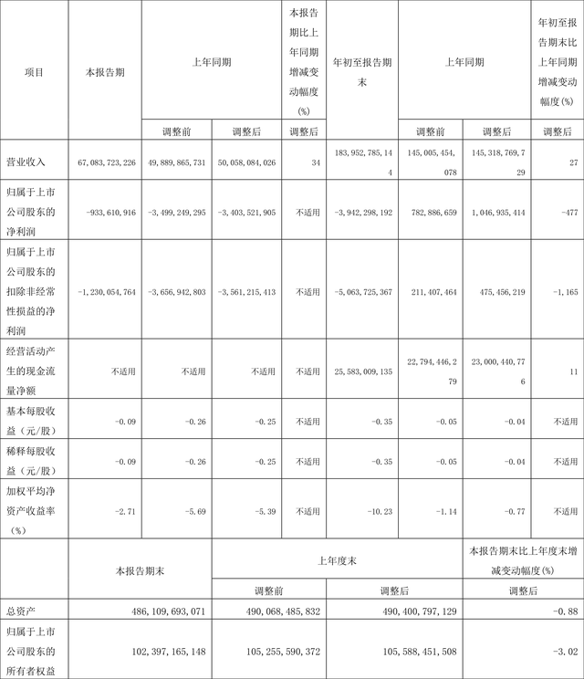根据三季报,公司第三季度实现营业总收入670.84亿元,同比增长34.01%,环比增长29.96%;归母净利润-9.34亿元,同比增长72.57%,环比增长54.51%;扣非净利润-12.3亿元,同比增长65.46%,环比增长49.15%。