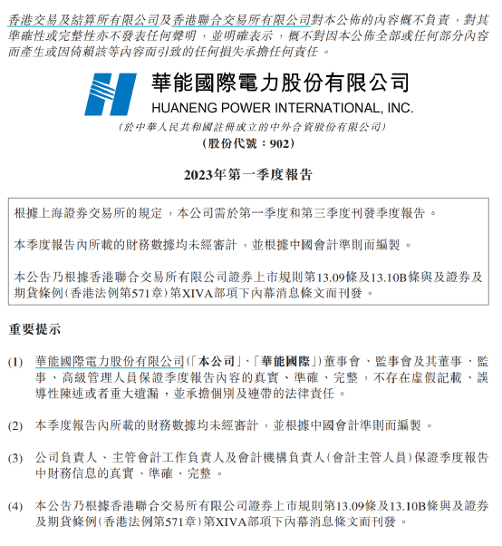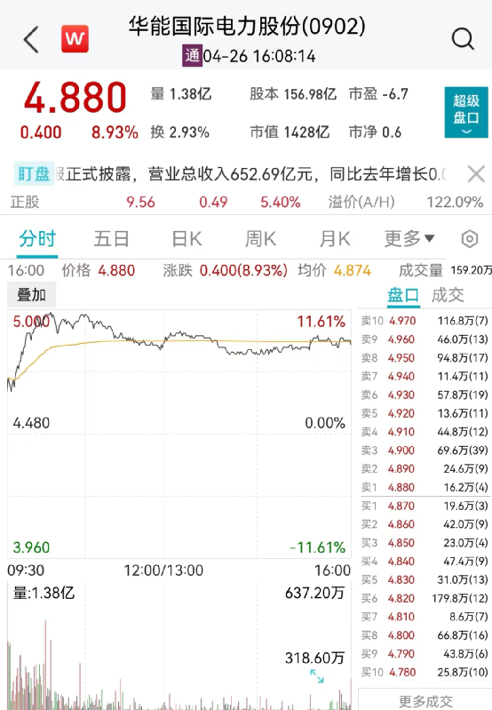 4月26日,业绩+行业数据双重利好叠加下,华能国家电力股份股价大幅高开,一度涨11.61%,随后涨幅收窄,收于4.88港元,涨8.93%。