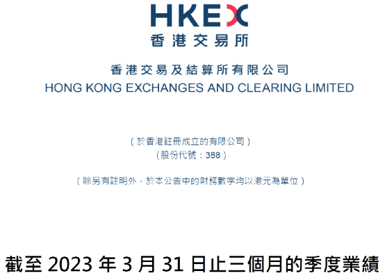 季报显示,香港交易所主要业务收入较 2022年第一季上升 5%,反映保证金与结算所基金的投资收益净额增加,但交易及结算费减少以及上市费收入减少已抵销部分升幅。