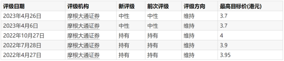 据Wind资讯,摩根大通证券4月26日发布评级报告称,维持华能国际电力股份“中性”评级,最高目标价为3.7港元,与此前最高目标价一致。近一年摩根大通证券对华能国际电力股份的评级如下: