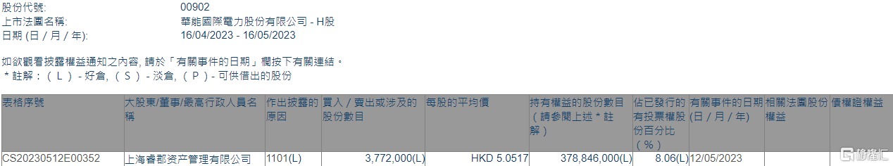 根据联交所最新权益披露资料显示,2023年5月12日,华能国际电力股份(00902.HK)获上海睿郡资产管理有限公司在场内以每股均价5.0517港元增持377.2万股,涉资约1905.5万港元。