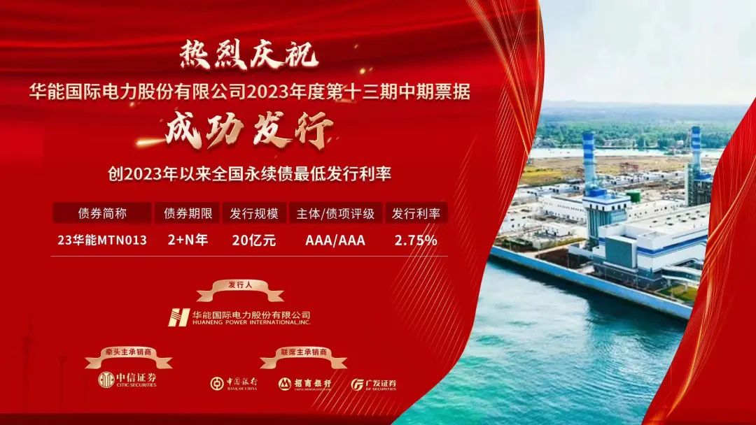 8月21日,华能国际2023年度第十三期中期票据成功发行。本期债券发行规模20亿元,发行期限2+N年,发行利率2.75%。继6月9日发行的第十二期中期票据后,再次刷新今年以来银行间永续中票最低利率,同时也创今年以来全市场永续债券发行利率新低。