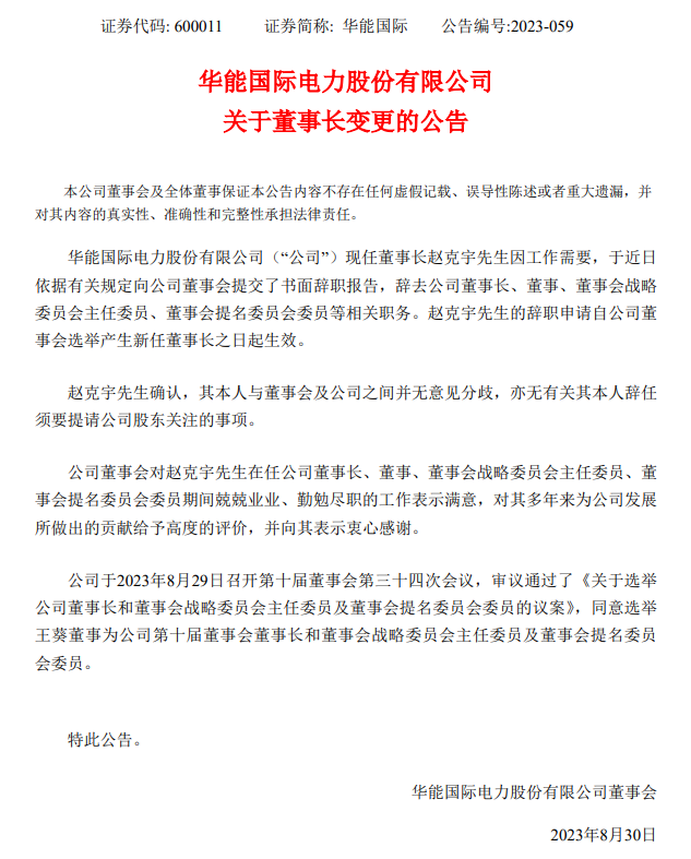 北极星电力网获悉,8月30日,华能集团下属上市公司华能国际发布《关于董事长变更的公告》,公告称,华能国际电力股份有限公司现任董事长赵克宇先生因工作需要,于近日依据有关规定向公司董事会提交了书面辞职报告,辞去公司董事长、董事、董事会战略委员会主任委员、董事会提名委员会委员等相关职务。赵克宇先生的辞职申请自公司董事会选举产生新任董事长之日起生效。