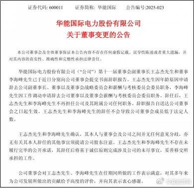华夏能源网&华夏电力(公众号hxdl3060)获悉,近日,华能国际电力股份有限公司(以下简称“华能国际”,SH:600011)公告称,第十一届董事会副董事长王志杰先生和董事李海峰先生已于近日分别向公司董事会提交书面辞职报告。