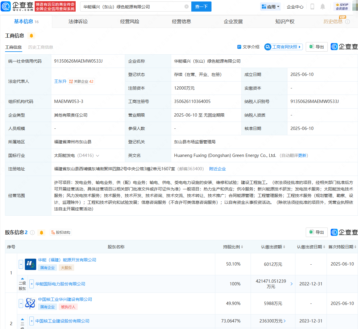 近日,华能福兴(东山)绿色能源有限公司成立,法定代表人为王东升,经营范围包含:发电业务、输电业务、供(配)电业务;热力生产和供应;供冷服务;新兴能源技术研发;发电技术服务;太阳能发电技术服务等。股权穿透显示,该公司由华能国际(600011)旗下华能(福建)能源开发有限公司、中国核建(601611)旗下中国核工业华兴建设有限公司共同持股。