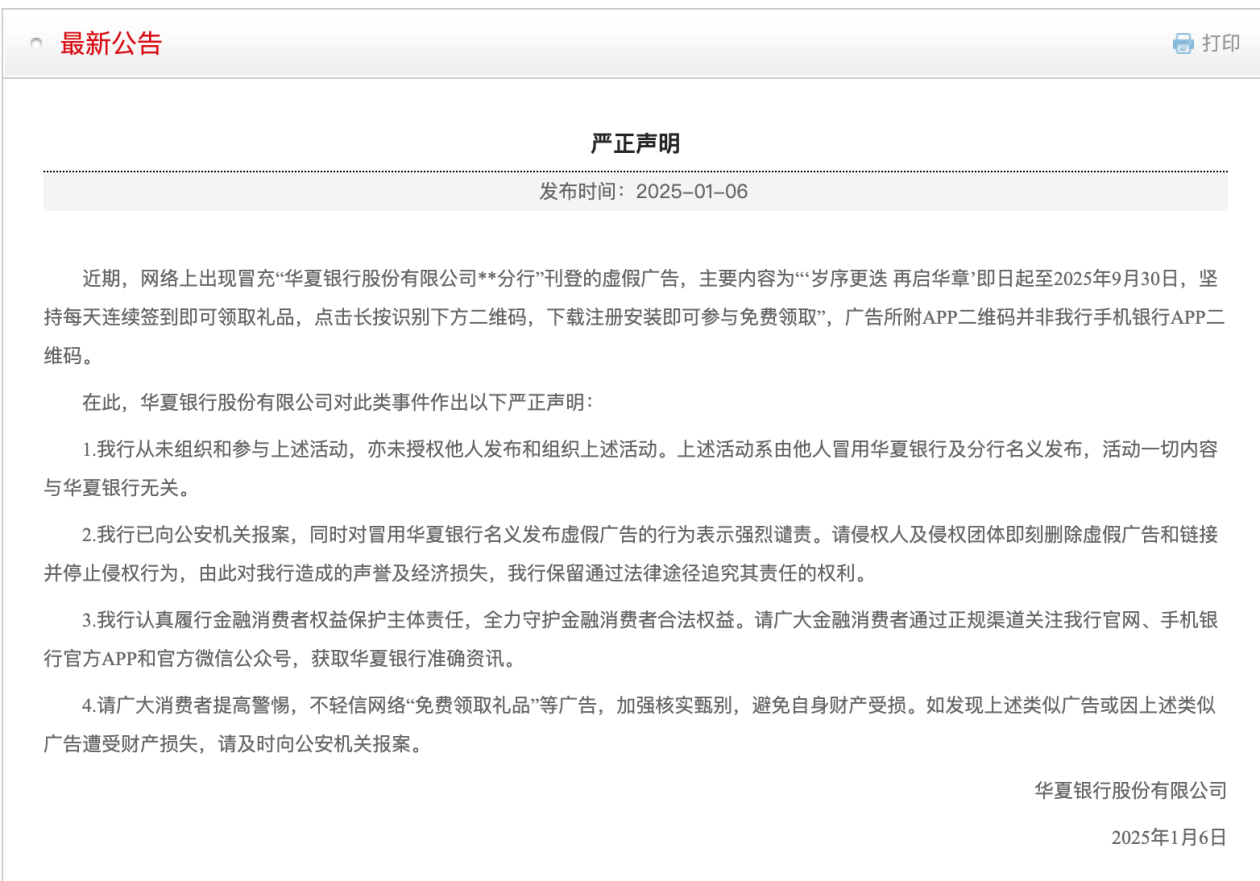 1月6日,华夏银行发表声明称,近期,网络上出现冒充“华夏银行股份有限公司**分行”刊登的虚假广告,主要内容为“‘岁序更迭再启华章’即日起至2025年9月30日,坚持每天连续签到即可领取礼品,点击长按识别下方二维码,下载注册安装即可参与免费领取”,广告所附APP二维码并非华夏银行手机银行APP二维码。