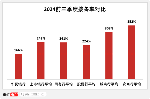截至2024三季度末,华夏银行的不良贷款拨备覆盖率为166%,较同期上市股份行平均水平低了58个百分点,较同期上市银行整体低了77个百分点。