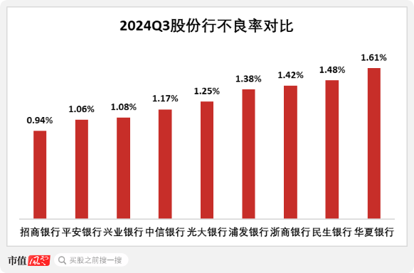 截至2024年三季度末,华夏银行的不良贷款率为1.61%,较上年末减少6个基点。虽然华夏银行的不良贷款率同比有所下降,但在9家A股上市股份银行中仍处于最高水平。
