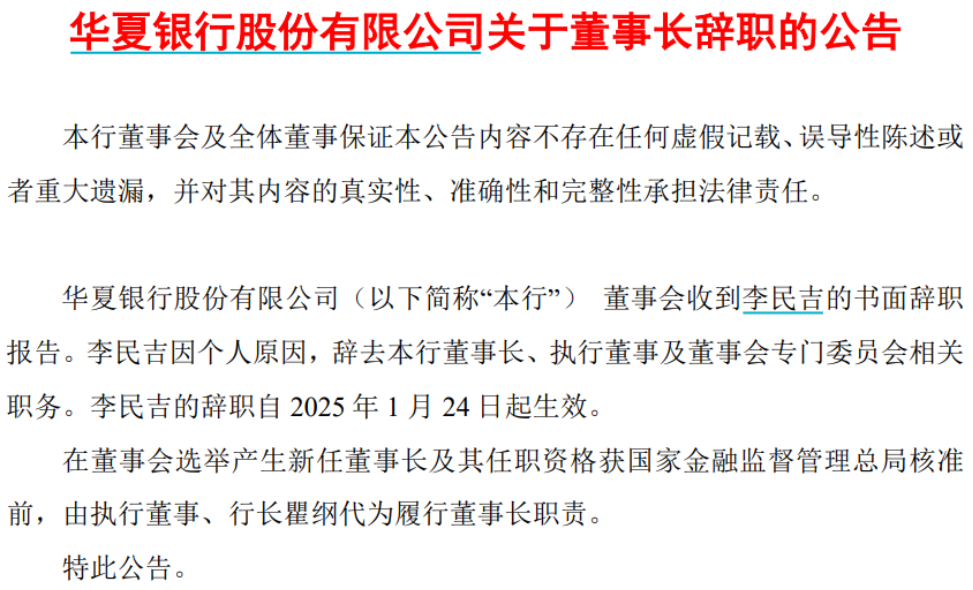 2025年春节假期前最后一个交易日(1月27日),华夏银行(600015.SH)公告了董事长李民吉辞职的消息。此前,有媒体称李民吉被相关部门带走调查,但未得到华夏银行官方证实。