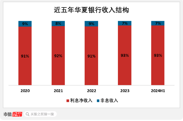 2024H1,华夏银行非息收入57亿元,占总营收的比重为7%,也就是说,其收入的93%依然是靠“吃存贷利差”获得的。