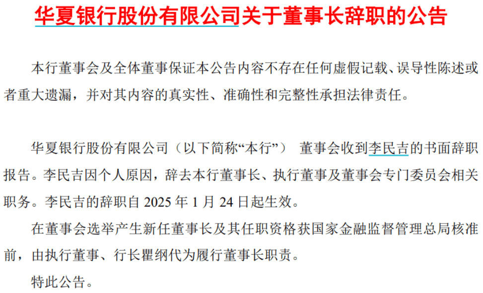 近日,华夏银行发布公告,宣布其董事长李民吉因个人原因辞去职务。在新任董事长经董事会选举产生并获得国家金融监督管理总局核准前,将由执行董事、行长瞿纲暂时代理董事长职责。