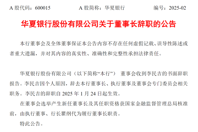 在春节前的最后一个工作日,华夏银行宣布其董事长李民吉因个人原因辞去所有相关职务,这一消息在金融界引起了广泛关注。李民吉自2017年4月起担任华夏银行董事长,至今已近八年,是近年来该行任职时间最长的高管之一。