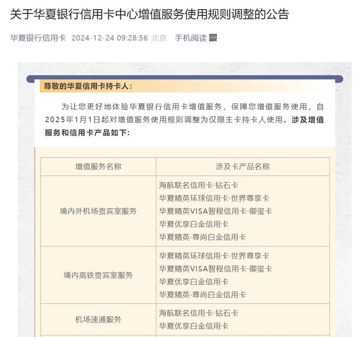 去年12月底,“华夏银行信用卡”公众号发文,宣布自2025年1月1日起对增值服务使用规则调整为仅限主卡持卡人使用。此次调整涉及增值服务包括7类,涉及的信用卡种产品超过10种。