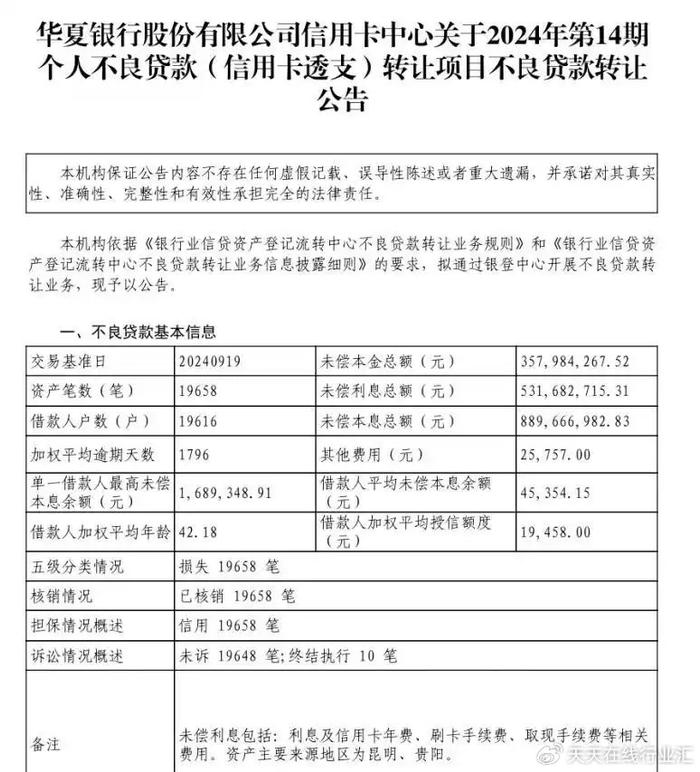 在提高信用卡权益享受门槛前一个月,华夏银行还转让了多笔不良资产。银登网公布了华夏银行信用卡中心关于2024年第14期个人不良贷款(信用卡透支)转让项目不良贷款转让公告,拟转让本息总额8.90亿,起始价仅为1990万元,相当于未偿还本息总额的2.24%。