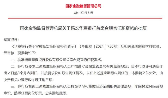 日前,国家金融监督管理总局官网公布一则任职批复,核准杨宏华夏银行股份有限公司(下称华夏银行600015.SH)首席合规官的任职资格。