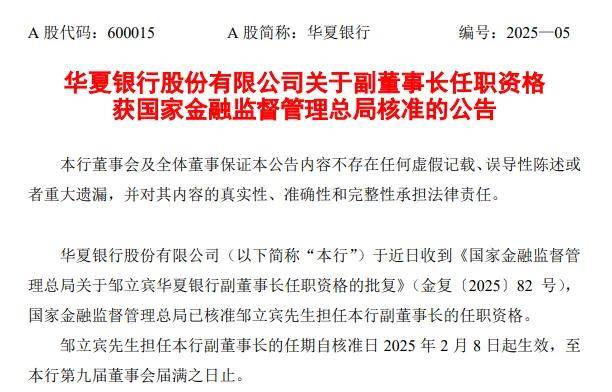 近期,华夏银行高层人事变动频繁,引发业界广泛关注。该行近日宣布,国家金融监督管理总局已正式核准邹立宾担任公司副董事长的任职资格。