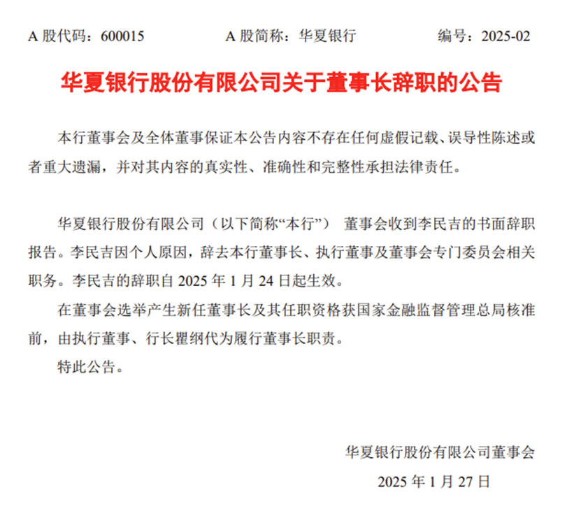 而在2025年1月24日,距离除夕仅剩三天时,华夏银行发布的一则董事长辞职公告,也如一颗投入平静湖面的巨石,激起千层浪。