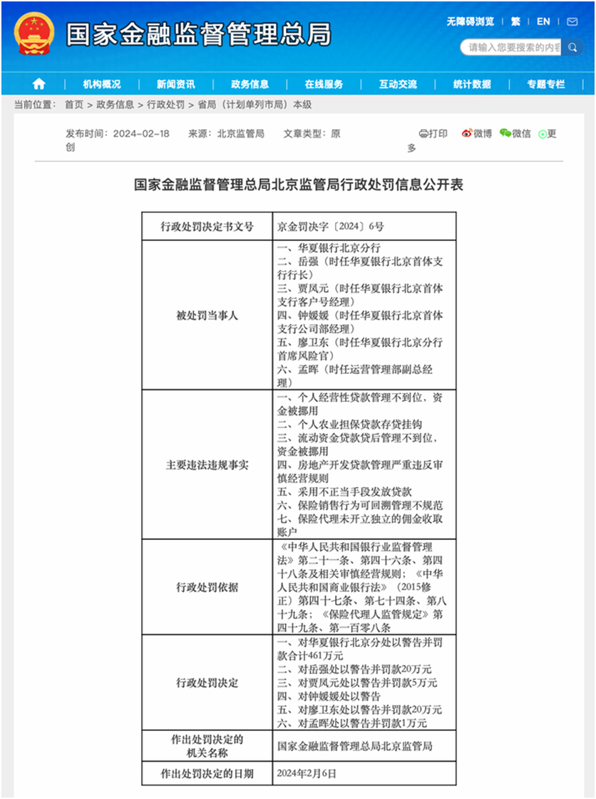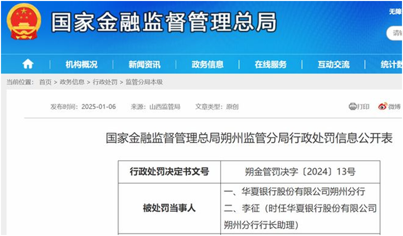 从国家金融监督管理总局网站发布的行政处罚信息公开表可知,一系列针对华夏银行分支行的处罚决定相继落地。