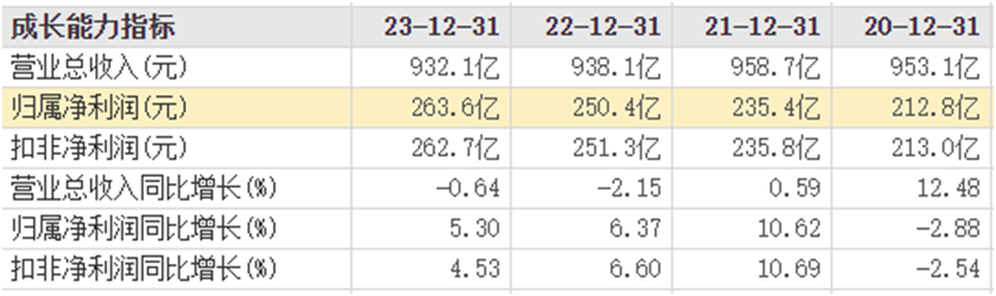 2020-2021年,营收分别为953.1亿元和958.7亿元,之后便开始下滑,2022年和2023年分别降至938.1亿元和932.1亿元,同比下滑2.15%和0.64%。尽管2024年前三季度实现正增长,但归母净利润增速较上年同期下降2.05个百分点,营收也仅微增0.04%。