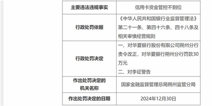 2025年1月6日,华夏银行朔州分行因在信用卡资金管控环节存在明显漏洞,被处以30万元罚款;回溯至1月3日,南通分行因贷款管理工作敷衍失职,领到40万元罚单;同日,连云港分行因福费廷部分资金违规回流开证人,且办理无真实交易背景银票业务,被罚款50万元,该行营销一部总经理徐蕾、时任营销四部总经理李琦也分别被处以6万元罚款。再看2024年12月31日,华夏银行扬州分行因将贷款、贴现资金转作存款或保证金,以不正当手段虚增存款,被罚款60万元,该行业务部总经理姜俊同样被罚款6万元。