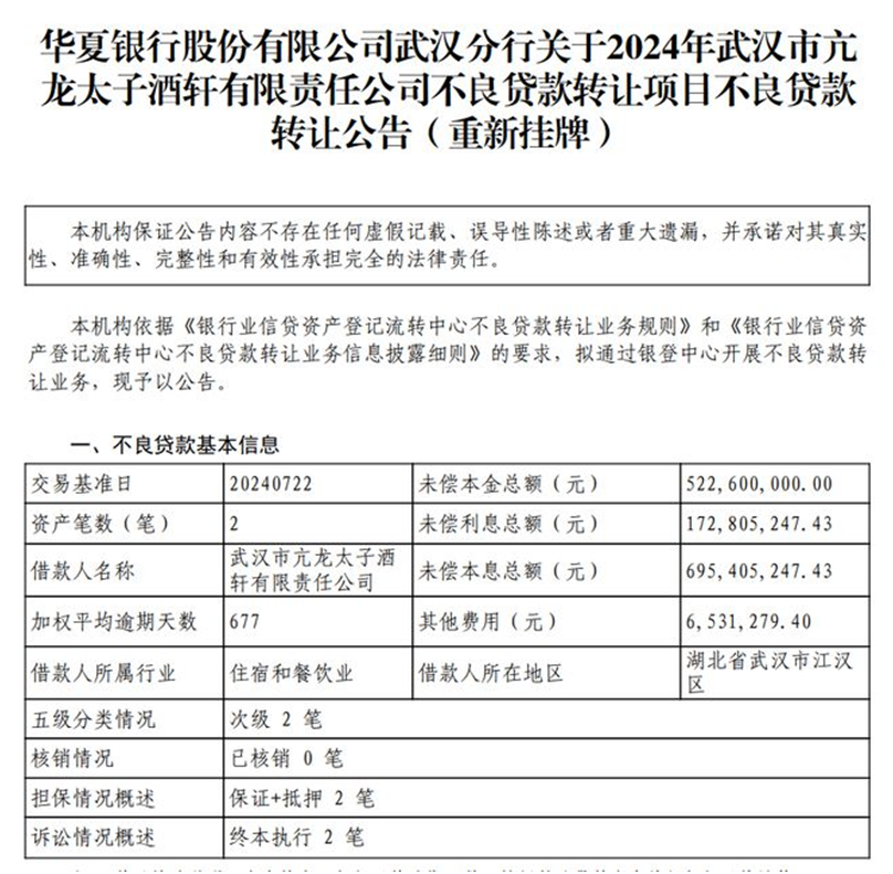 不良资产问题同样突出。自2022年末起,华夏银行就开始密集处置不良资产。2024年11月6日单日发布4期信用卡透支不良贷款转让项目,未偿本金总额31.64亿元,本息合计53.31亿元,挂牌起始价却仅为本金的9.6折。此外,还三次挂牌转让武汉亢龙太子酒轩公司不良贷款,起始价累计降幅达43%。