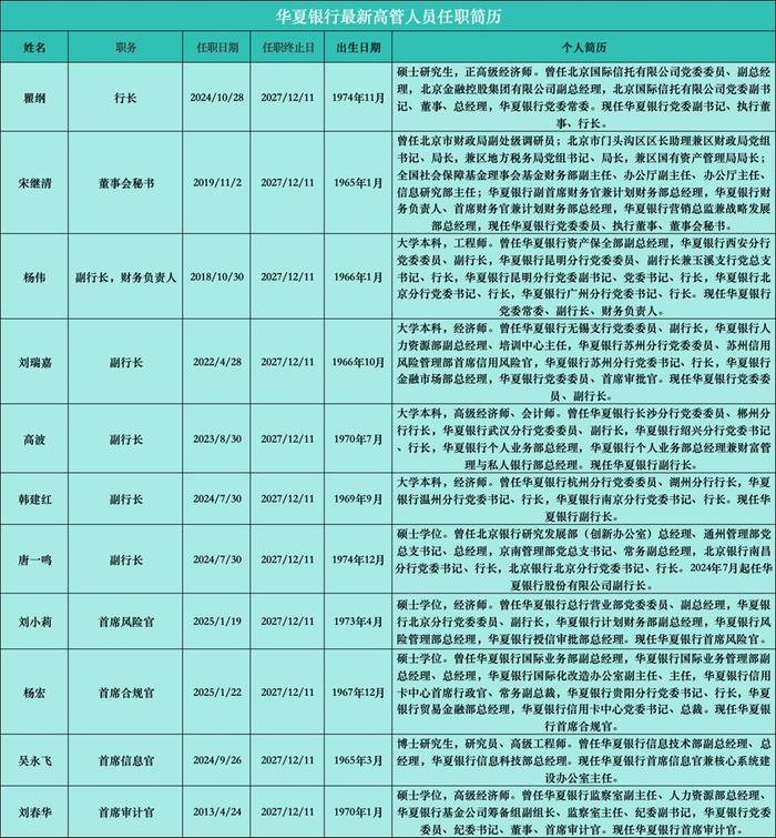 然而,2024年以来不仅是董事长和行长变动相对频繁,华夏银行其他高管人员亦有大变动,高层可谓“大洗牌”。