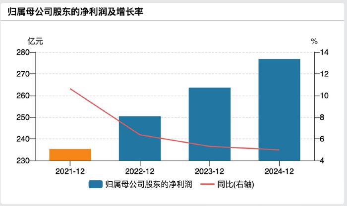 2021年—2024年,华夏银行实现营业收入958.70亿元、938.08亿元、932.07亿元和971.46亿元,同比增长0.59%、-2.15%、-0.64%和4.23%;实现归母净利润235.35亿元、250.35亿元、263.63亿元和276.76亿元,同比增长10.62%、6.37%、5.30%和4.98%。