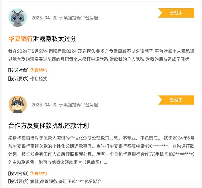 在黑猫投诉[下载黑猫投诉客户端]网搜索华夏银行,涉及的投诉有4864条,其最近的两条是,“华夏银行泄露隐私太过分”,“合作方反复催款扰乱还款计划”。
