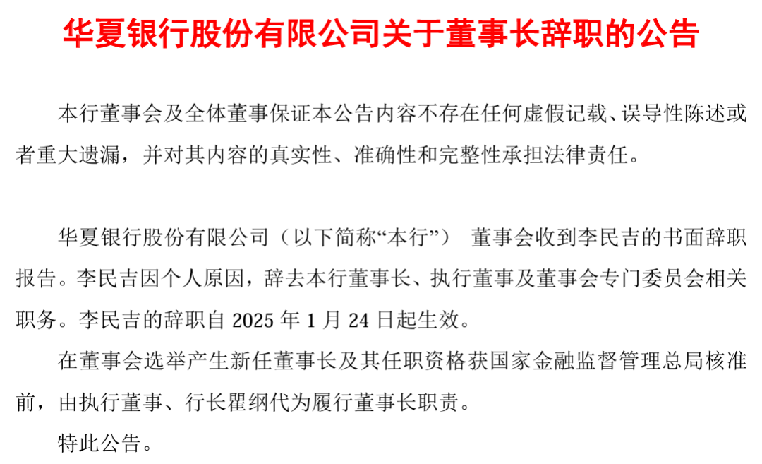 此前2025年春节前最后一个工作日(1月27日)盘后,华夏银行公告了董事长李民吉辞职的消息。