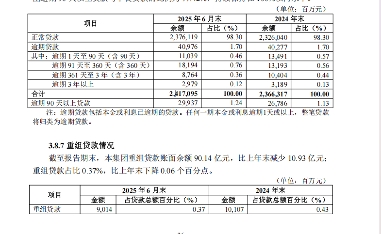截至6月末,华夏银行90天的逾期贷款比例为1.24%,较2024年年末的1.13%上升了0.11个百分点。尽管如此,该行的重组贷款余额从2024年末的101.07亿元减少至90.17亿元。