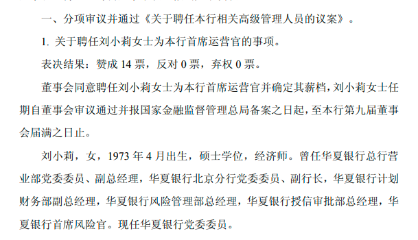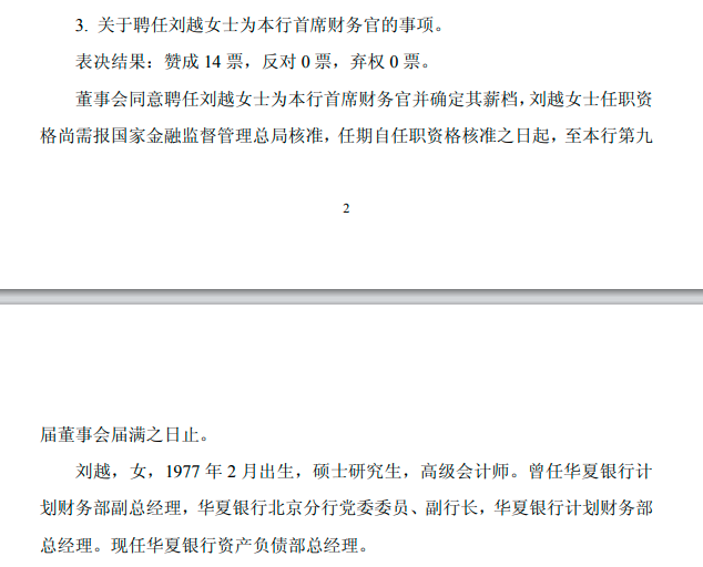作为高级会计师,新CFO刘越长期在华夏银行深耕,历任华夏银行计划财务部副总经理、北京分行副行长、总行计划财务部总经理,现任资产负债部总经理。