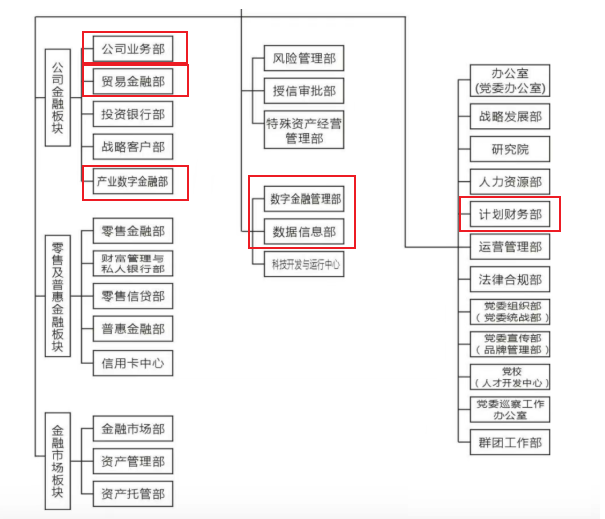 总行部门的拆并整合引发关注。其中,业务部门升级为“公司金融部”,贸易金融部与产业数字金融部合并为“交易银行部”,计划财务部“一分为二”,拆解为财务会计部和资产负债管理部。