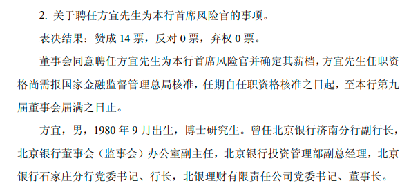 其中,原首席风险官刘小莉调任首席运营官(COO),原北银理财董事长方宜出任首席风险官(CRO),资产负债部总经理刘越晋升为首席财务官(CFO)。