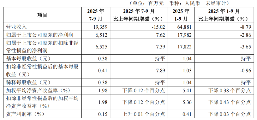 从业绩上来看并不是很理想,前三季度营业收入648.81亿元,同比下降8.79%,归属于上市公司股东的净利润179.82亿元,同比下降2.86%,降幅较上半年有所收窄。