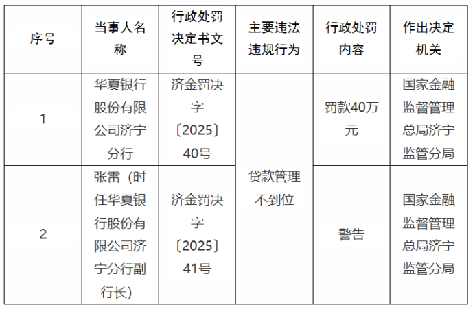 日前获悉,国家金融监督管理总局济宁监管分局12月31日公布的行政处罚信息公开表显示,华夏银行济宁分行因贷款管理不到位,被处罚款四十万元。时任华夏银行济宁分行副行长张雷该违法违规行为负有责任,被给予警告处罚。