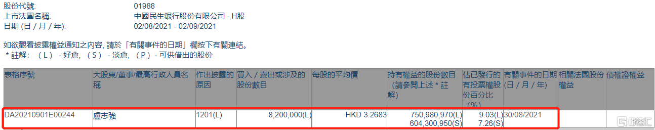 格隆汇APP获悉,根据联交所最新权益披露资料显示,2021年8月30日,民生银行(01988.HK)遭非执行董事卢志强在场内以每股均价3.2683港元减持好仓820万股,涉资约2680万港元。