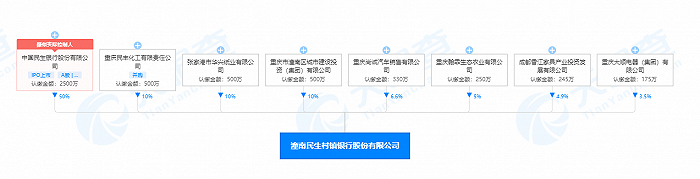 股权构结上,中国民生银行持有潼南民生村镇银行50%股份,是该行大股东,认缴出资额2500万元。此外,重庆市潼南区城市投资(集团)有限公司、重庆民丰化工有限责任公司等7位股东均持有该行10%至3.5%不等的股份。